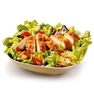 salade, tomate, carotte, maïs, oignons et sélection de viandes et poisson